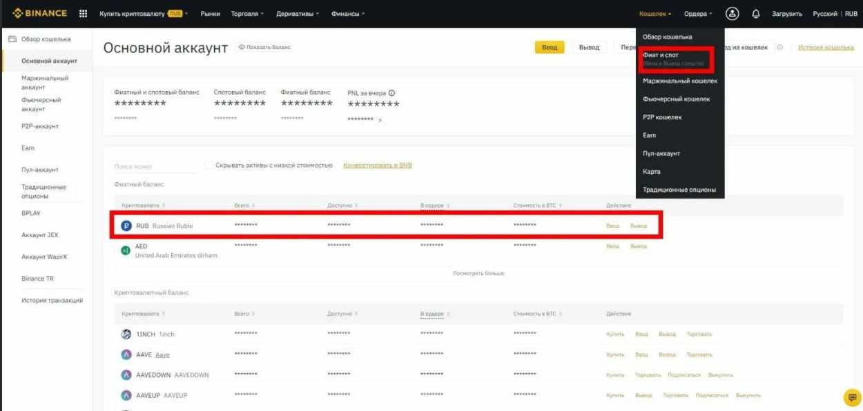 Переходим в меню «Кошелек» с верхней панели. Указываем «Фиат и спот».