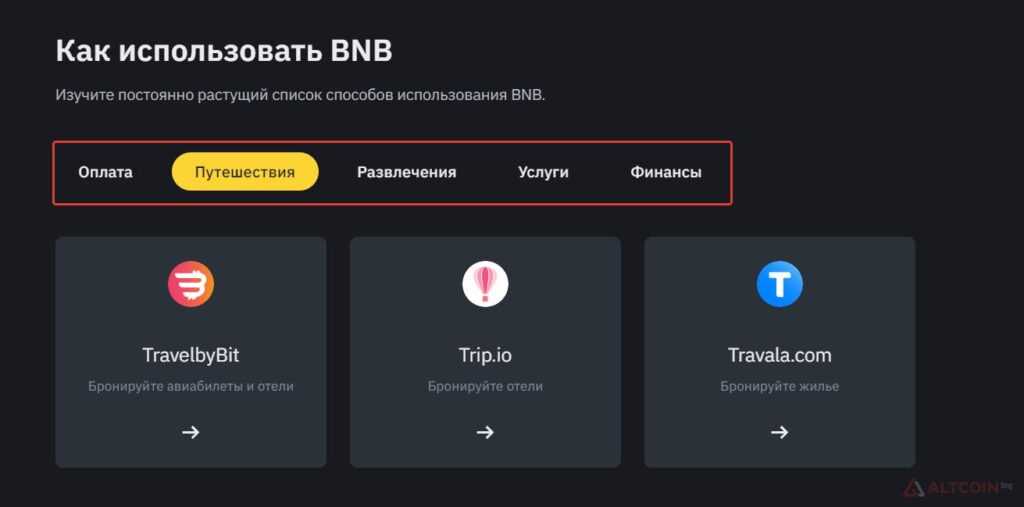 Криптовалюту BNB можно использовать в качестве платежного средства на сторонних сервисах. Например, бронировать отели, приобретать авторские права, оплачивать авиационные товары и многое другое. Подробная информация по этому вопросу доступна на .