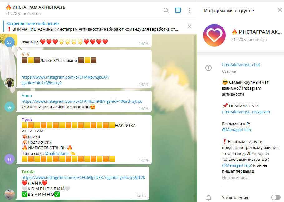 Другой вариант – чаты активности. Они есть в Инстаграм, Telegram, WhatsApp и Viber. Это способ набрать ответы и лайки к фото от живых пользователей. Необходимо выполнить действия как минимум для трех пользователей, чтобы получить взаимные реакции. Если задания не выполнять, в чате заблокируют. Также за слишком активную деятельность в чужих профилях на ваш аккаунт могут наложить временный бан.