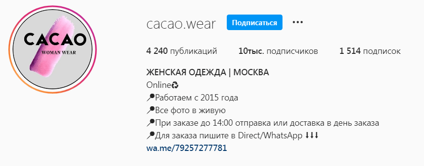Если у вас есть сайт, его обязательно нужно указать. Если сайта нет, можно создать мультиссылку (по типу Taplink) и добавить ее. В ней стоит указать ассортимент, цены, добавить фото, указать адрес и добить кнопки связи. Это позволит повысить удобство взаимодействия с профилем и снизить количество поступающих в директ однотипных вопросов.