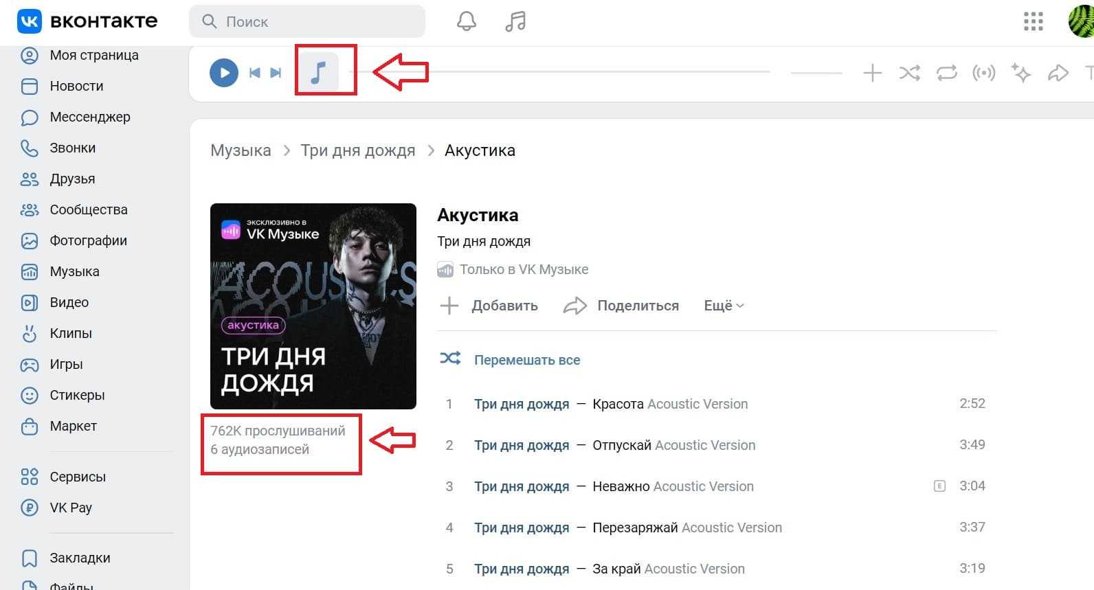 Для аудиозаписей информацию можно найти в разделе «Моя музыка» в приложении ВКонтакте. Под каждой композицией отображается количество прослушиваний за определенный период.