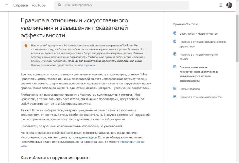 Правила YouTube о накрутке активности на платформе. Скриншот: Cправка — Google