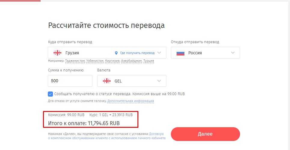 Отправлять через этот сервис можно лишь рубли, но в процессе они могут быть конвертированы в лари, евро или доллары. Возможности получить перевод в рублях нет. Комиссия за услугу рассчитывается индивидуально и будет указана при расчете размера перевода (как и курс конвертации).