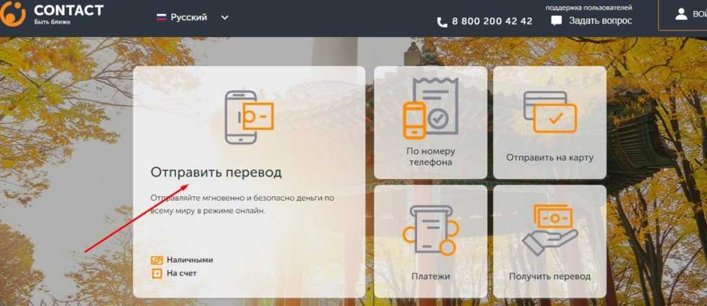 Для перевода денег сначала нужно зайти на сайт Contact, там выбрать раздел «Отправить перевод»: