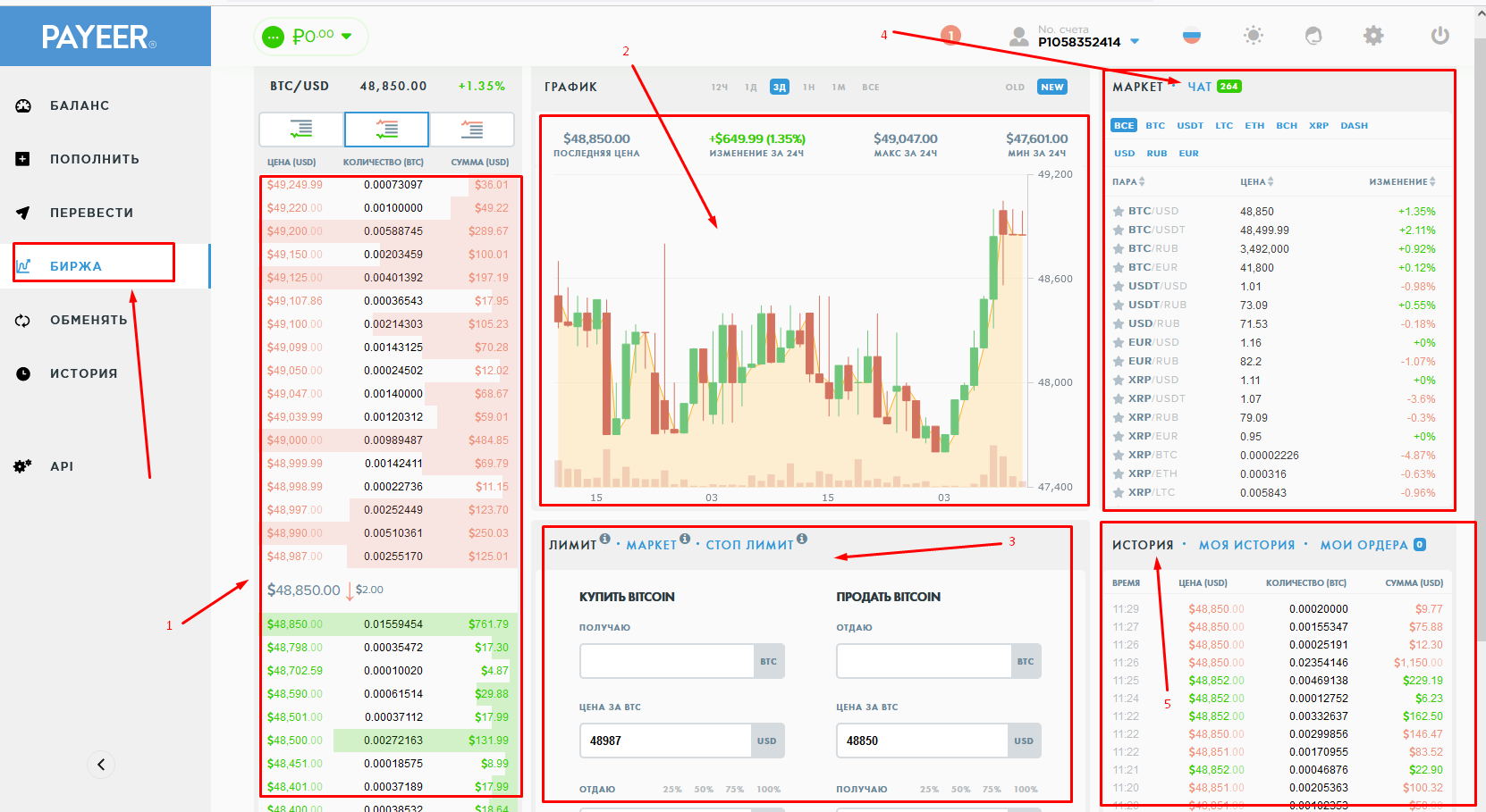 - Справа от графика криптовалют расположены активы (окно маркет), между которыми можно переключаться, а также чат для общения. По состоянию на 2021 год криптовалюты на бирже PAYEER Exchange представлены только самыми основными монетами: BTC и LTC, ETH и XRP, DASH, BCH и Они торгуются по отношению к USD, EUR, RUB.