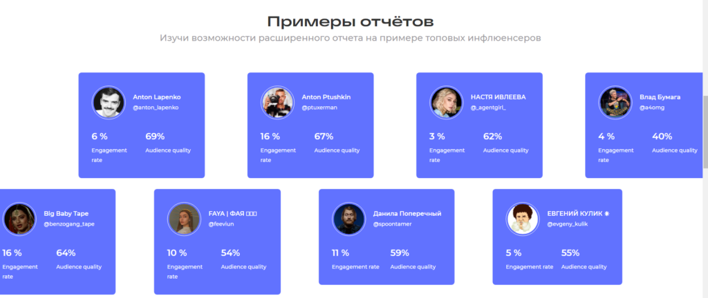 Площадка также поможет узнать, кого рекламирует блогер и какой результат от его кампаний, что поможет выбрать наиболее выгодное предложение. Стоимость услуг – от 9.99 $. Есть возможность бесплатных проверок по ограниченному списку показателей.