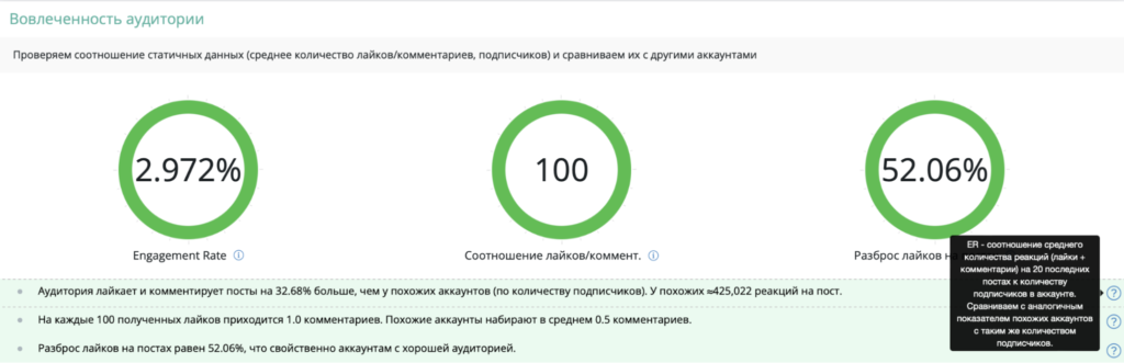 Отследить накрутку поможет и блок “Вовлеченность аудитории”. Если сервис выделяет три ключевых показателя зеленым – все в порядке, если желтым – могло быть и лучше, ну а если все красное – аккаунт некачественный.