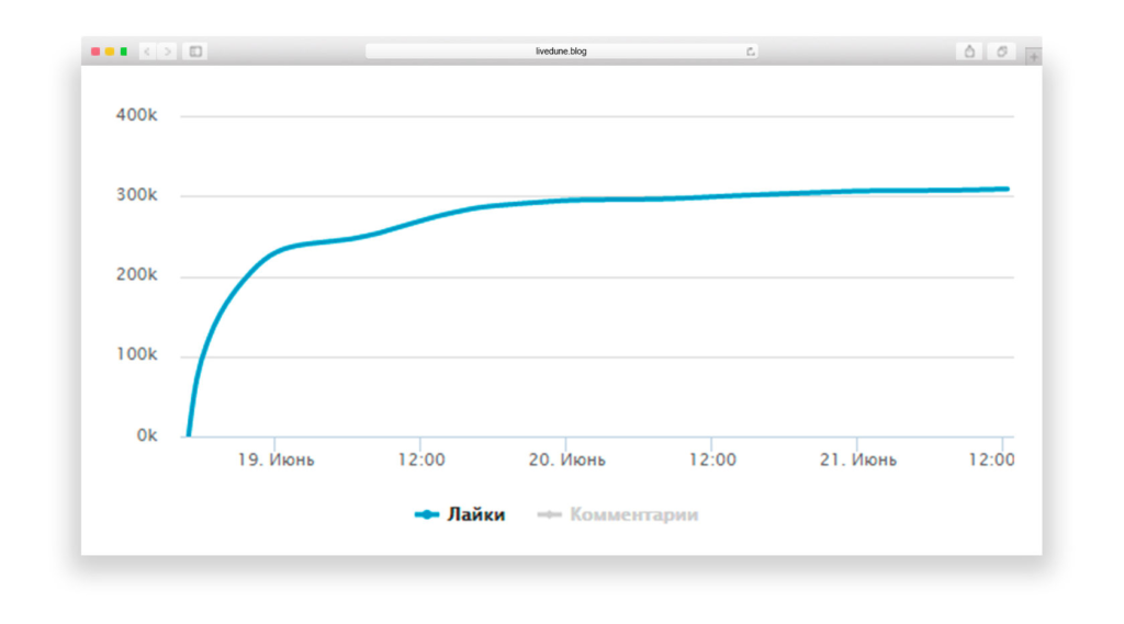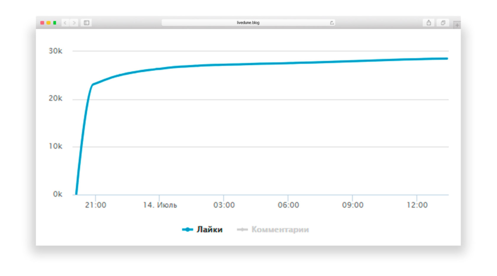 Резкий рост в первый час нехарактерен для естественно передвигающихся аккаунтов. Посты в группе с активными подписчиками набирают лайки в первые сутки после публикации, а затем медленно продолжают получать реакции. График при этом выглядит так: