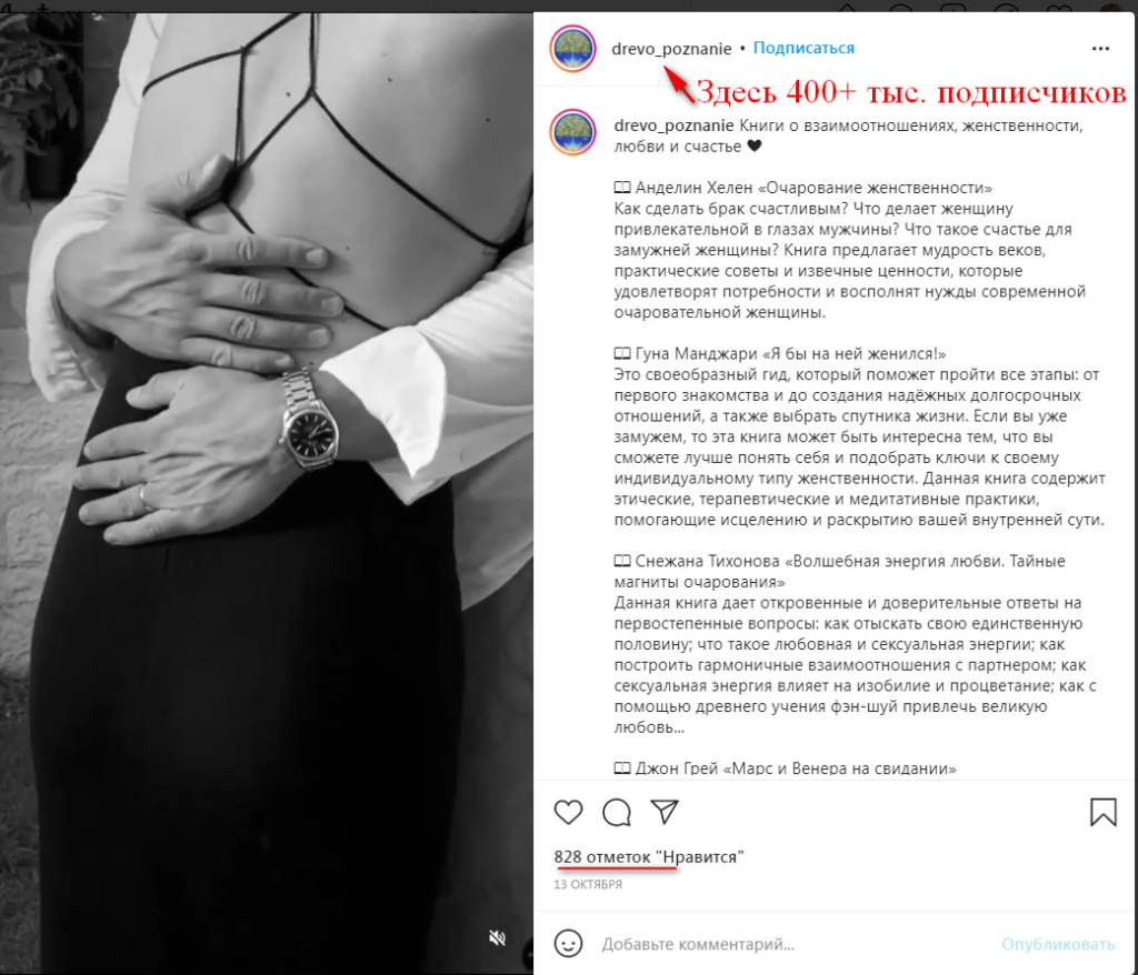 На примере выше число лайков подозрительно большое в сравнении с размером подписчиков.