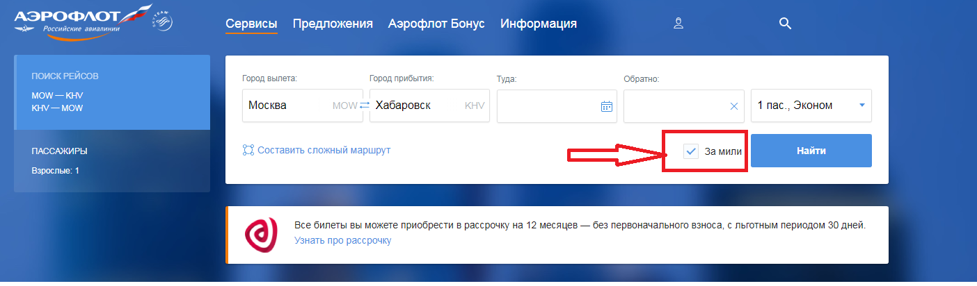 Этот вариант предполагает покупку на официальном сайте «Аэрофлота». По сути, схема приобретения ничем не отличается от покупки на сайте компании-партнера.