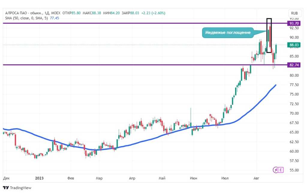 С точки зрения технического анализа картина неоднозначная. С одной стороны, акции продолжают находиться в восходящем тренде и торгуются выше 50-дневной (обозначена синим цветом). С другой, приверженцы японских свечей могут возразить: 14 августа сформировано , которое сигнализирует о развороте. Чтобы опровергнуть данный паттерн, необходимо преодолеть его максимум — 93,7 рубля. Эта отметка является и текущим уровнем сопротивления. Уровень поддержки — 82-83 рубля. Наглядно это можно увидеть из дневного свечного графика: