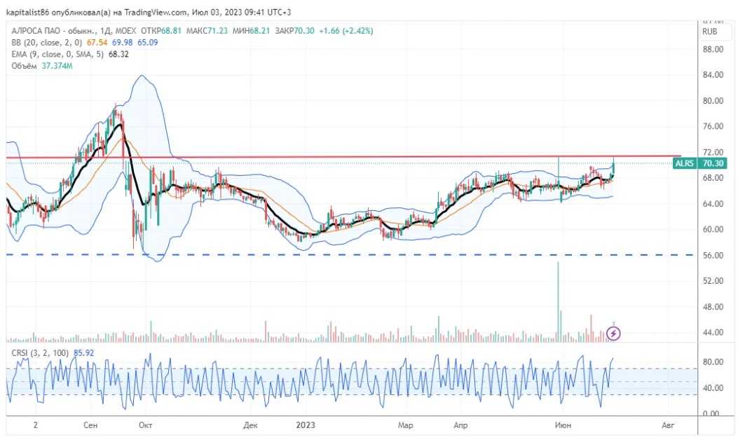 На сегодняшний день стоимость акций Алроса составляет порядка 67 рублей. С начала года бумаги показывают медленный, но уверенный рост: