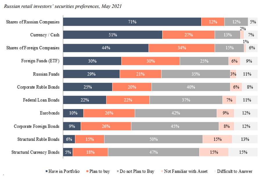 — По состоянию на май 2021 года, по данным РБК, акции российских компаний были наиболее распространенным инвестиционным активом среди российских розничных инвесторов. 71% российских розничных инвесторов владеют акциями хотя бы одной российской компании, а 12% планируют приобрести акции хотя бы одной российской компании. Мы считаем, что ключевой причиной инвестирования в акции российских компаний является то, что эти бренды и компании хорошо известны россиянам. Респонденты указали, что предпочитают удобство, связанное с отсутствием необходимости подавать декларации о дивидендах, потенциальную прибыль от роста стоимости недооцененных российских компаний, высокие дивиденды и возможность приобретать акции российских компаний в рублях. Эти преимущества отметили более трети россиян, опрошенных РБК.