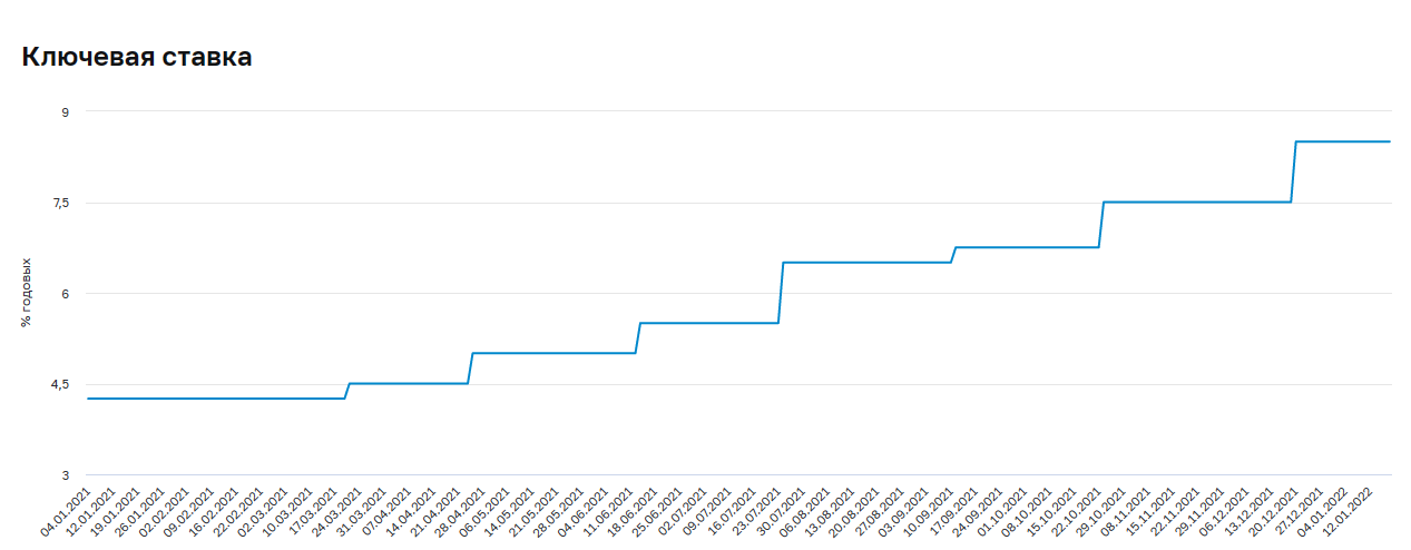 В марте исполнится год с того момента, как ЦБ РФ начал цикл повышения ключевой ставки. Сейчас она находится на уровне 8,5%, однако, скорее всего, это не предел. С большой вероятностью, в этом году мы увидим еще одно-два повышения, так что в итоге ставка поднимется примерно до 9%, п инфляция постепенно начнет возвращаться в более приемлемые рамки.