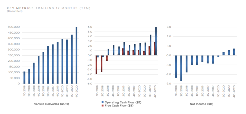 Представленные данные отражают значительный рост ключевых финансовых показателей Tesla в 2020 г.