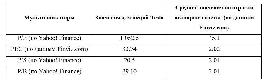 Мультипликатор P/E показывает, что при нынешних объемах чистой прибыли компании понадобится свыше тысячи (!) лет, чтобы окупить свою стоимость, в то время как обычно инвестиции в автомобильные компании окупаются в среднем за 45 лет. С учетом пятилетнего прогноза по росту чистой прибыли в расчете на одну акцию (EPS), справедливая цена для акций Tesla сейчас находится в районе $40 за ЦБ.
