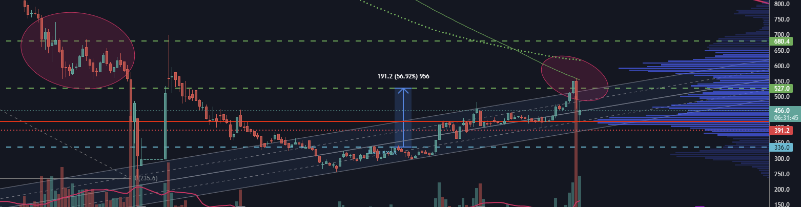 Акция находится в восходящем тренде на недельном и дневном таймфрейме. Точка смены тренда находится на уровне 391.2 рубля. На днях актив дошел до уровня начала СВО (санкций) 559.6 рубля. Там же находится важный уровень 200 MA (зеленая линия на графике). Многие трейдеры (торговые боты) ориентируются на данную скользящую среднюю, пока цена находится ниже для них тренд нисходящих и никаких лонгов. Как правило, с первого раза такой важный уровень не пробивается, что мы увидели на днях.