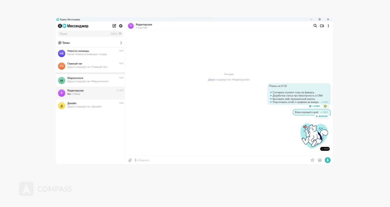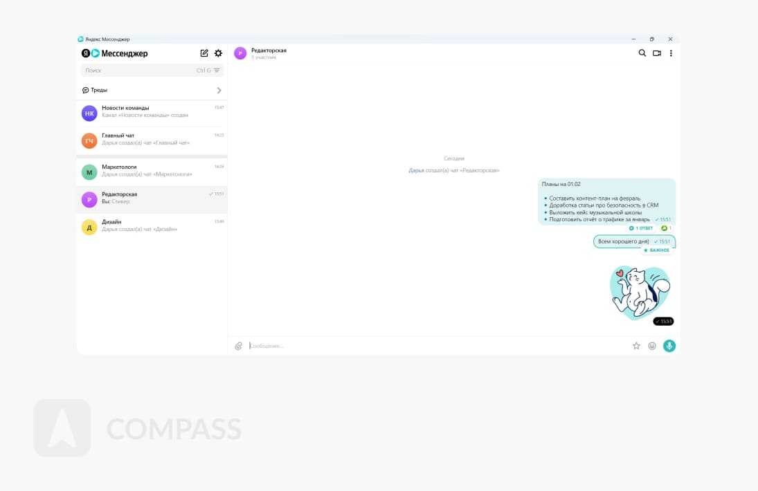 2. Яндекс Мессенджер — сервис для коммуникации с коллегами. Есть приложение для мобильных устройств (Android и iOS), десктопное приложение (Microsoft и macOS), браузерная версия. Здесь можно создавать пространства для каждой команды, созваниваться с партнерами по проекту по видеосвязи, отправлять друг другу голосовые сообщения, уточнять данные в тредах.