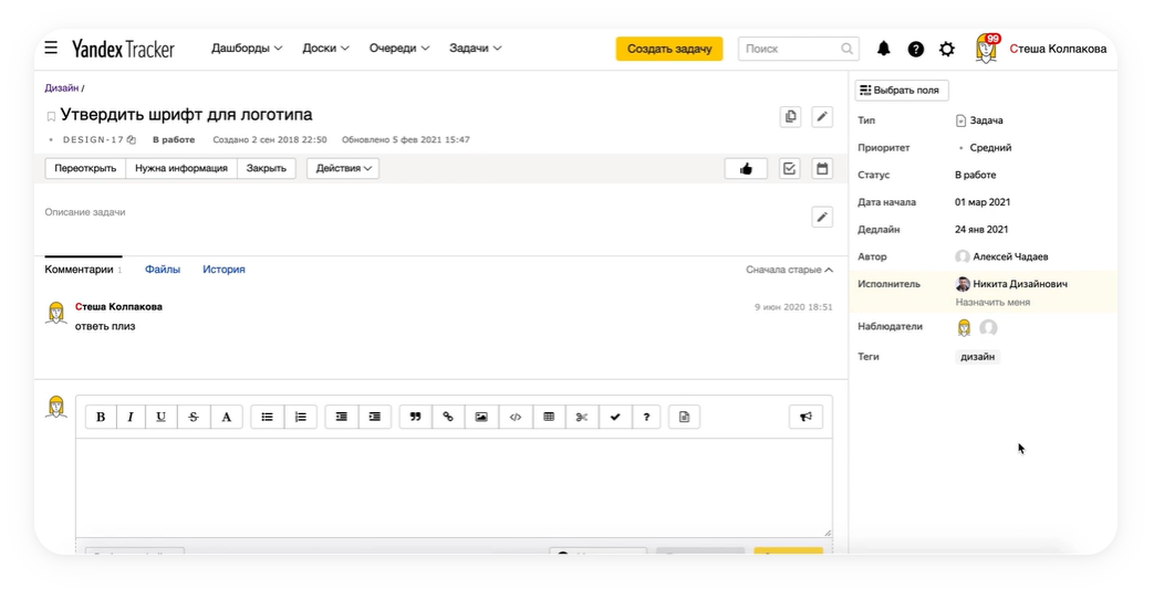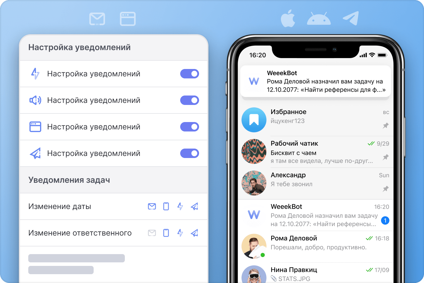 Представляет собой набор инструментов для совместной работы: канбан-доски, недельный календарь, управление задачами и другое. Сами разработчики описывают сервис как «удобный и гибкий» – можно не только вести дела (просматривать, комментировать и следить за прогрессом), но и создать свою базу знаний для компании (загрузить туда актуальные регламенты, инструкции и правила). Существует система уведомлений (Телеграм, электронная почта или push).