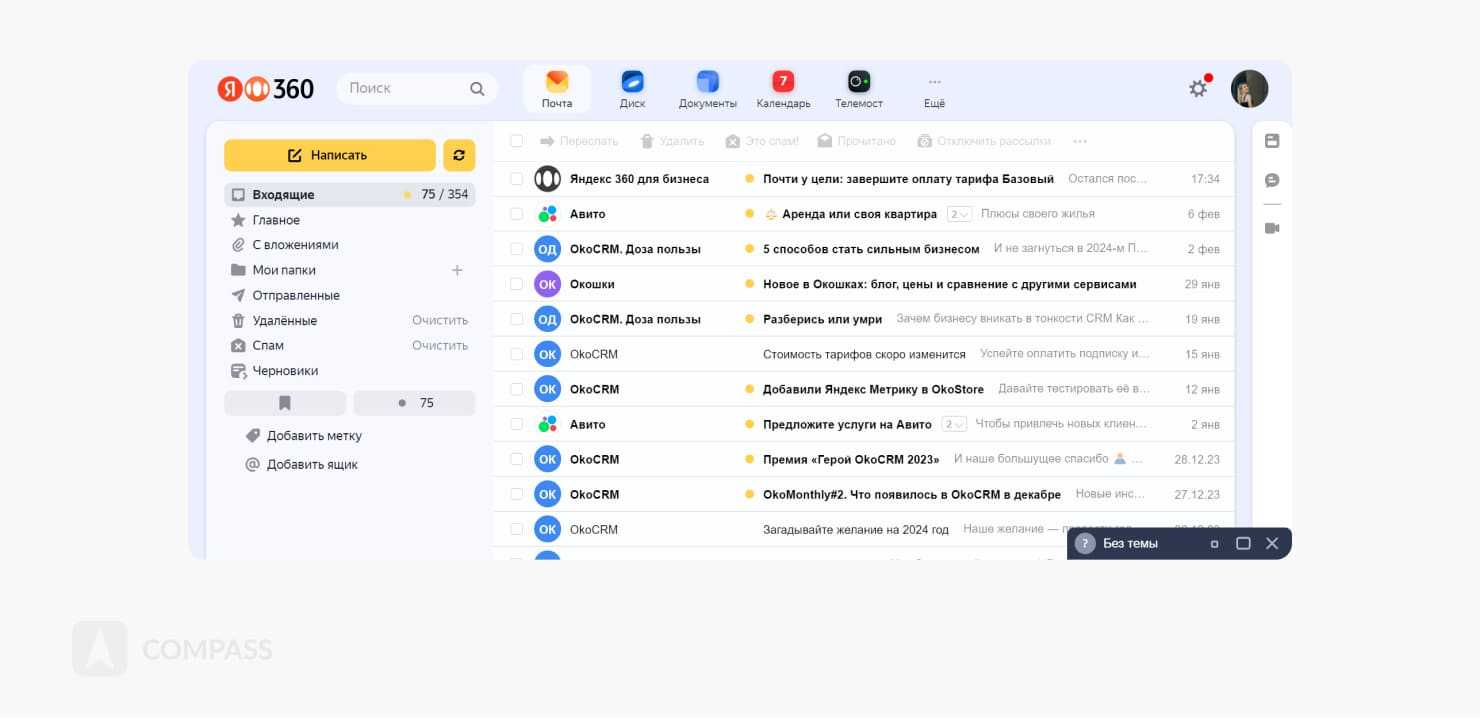 7. Google Suite → «Яндекс 360 для бизнесаУ «Яндекса» аналогичная базовая функциональность: почта, диск, календарь, сервис видеозвонков и мессенджер.