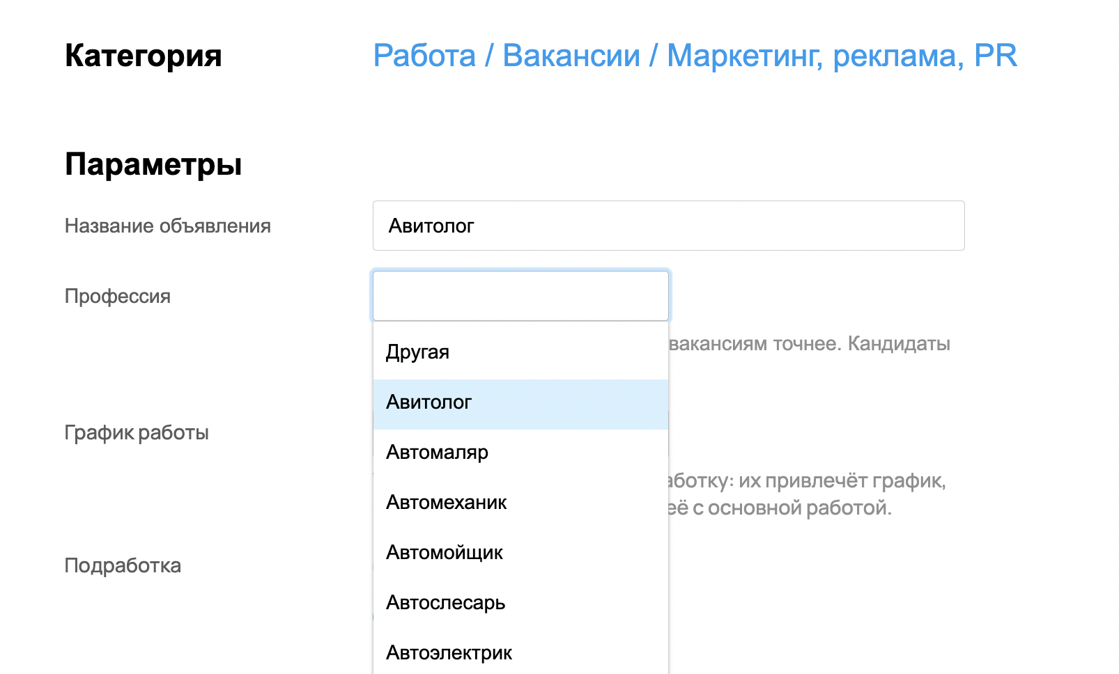 Чем больше пользователей появлялось на Авито, тем больше предпринимателям нужно было работать над объемом и качеством своих объявлений. Авито тоже не отставал и развивал возможности для продвижения. В связи с этим на рынке появилась потребность в профильных специалистах, которые знают особенности Авито как площадки и умеют грамотно работать с ее маркетинговыми инструментами. Так и появилась профессия авитолога, а спустя время сам Авито добавил ее в список профессий при публикации вакансии:![]()