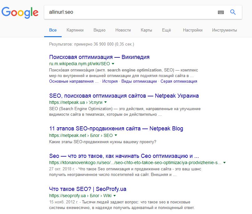 Помогает найти сайты, в URL-адресе которых встречаются указанные вами слова. Для более эффективного поиска рекомендуется писать запрос на английском или транслитом.
