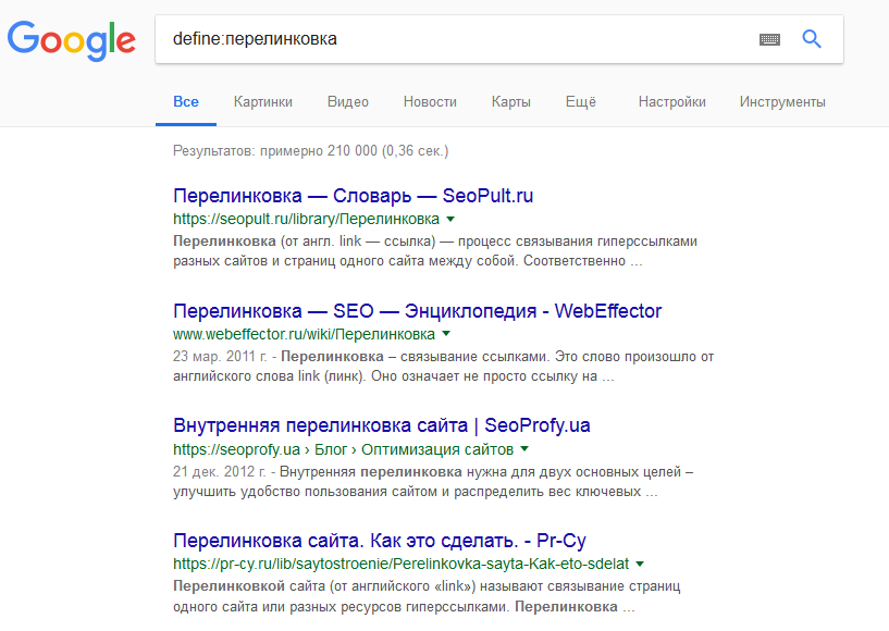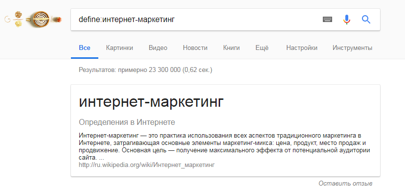 Помогает быстро найти определение термина, введенного в запросе. Обычно в результатах представлены справочные ресурсы, например, Википедия.