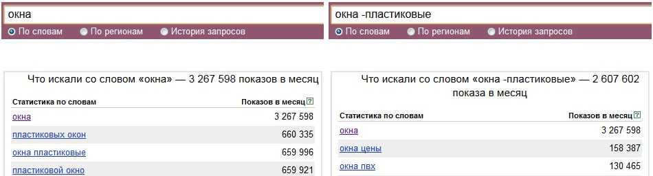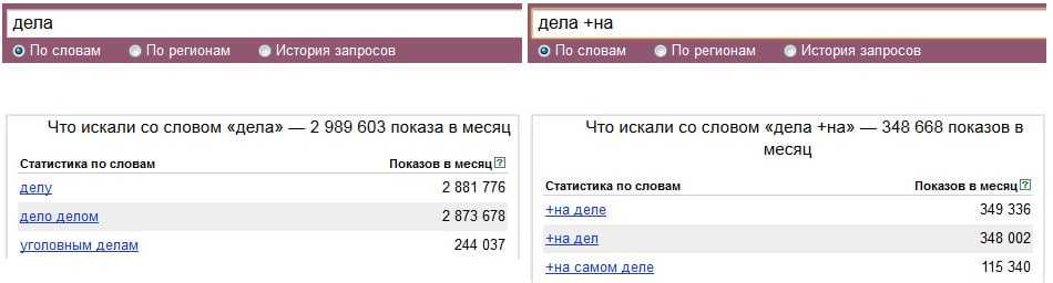 Например, анализируя через WordStat запрос «”подбор слов”», Вы не увидите в выдаче позиции с дополнительными словами: «подбор слов яндекс», «подбор ключевых слов» и т.д. При этом останутся показы, состоящие из различных форм введенных слов: «подборы слов», «слова подбор» и т.д.