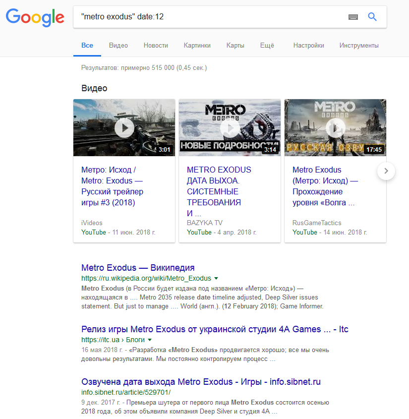 По этому запросу Гугл выдаст все новости об игре Metro Exodus за последние 12 месяцев.