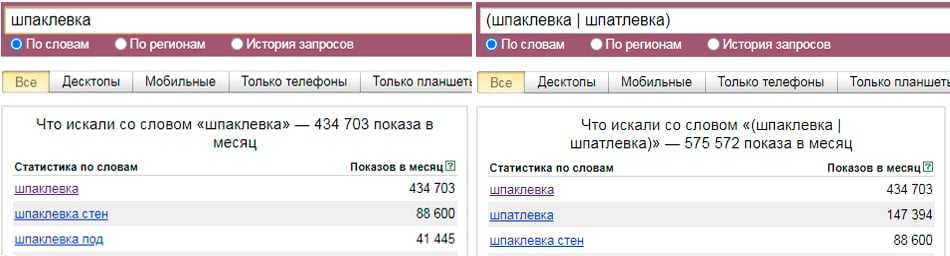 Так, например, специалист может смешать запросы «шпаклевка» и «шпатлевка», так как пользователи руководствуются единой целью, когда вводят их. В данном случае учет нетипичной словоформы позволил определить значительный прирост количества показов, а значит имеет смысл добавление данного ключа в семантическое ядро.