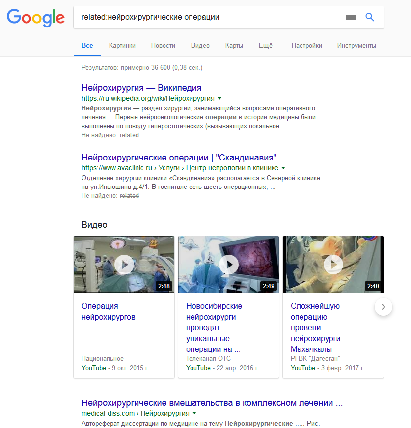 Google ищет страницы со схожим содержимым. Это актуально для узкоспециализированных тематик и вопросов, по которым мало информации. Также с помощью «related» можно находить сайты конкурентов с похожими материалами.
