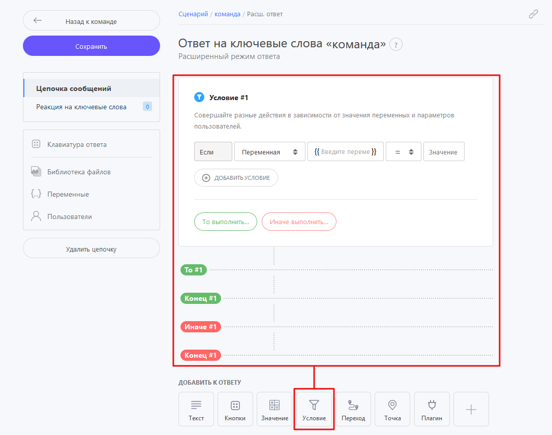- Нам снова потребуется перейти в «Сценарии» и создать новую команду.