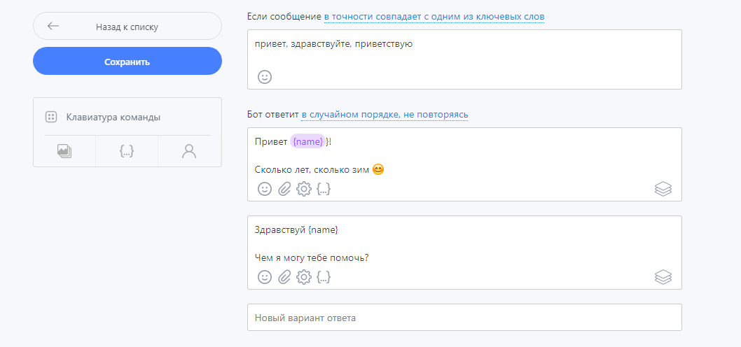 - В графе ключевые слова вводим возможные ключи: «привет», «здравствуйте», «приветствую» и так далее.