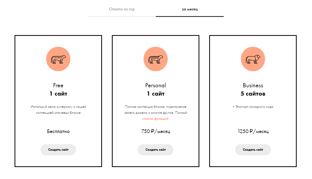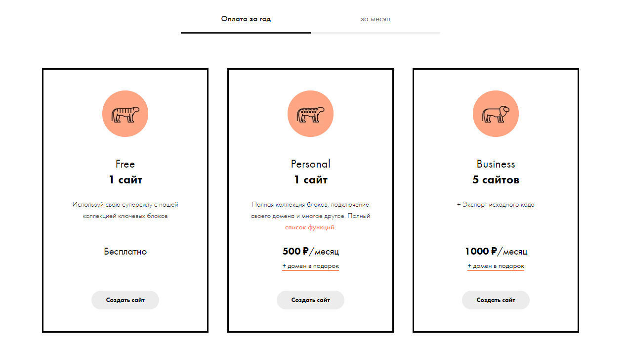 У «Тинькофф» банка разработан бесплатный и легкий в использовании конструктор сайтов. Однако доступ к платформе открывается только клиентами и держателям банковских карт данного банка. Пользователю можно создать 10 сайтов с неограниченным количеством страниц.