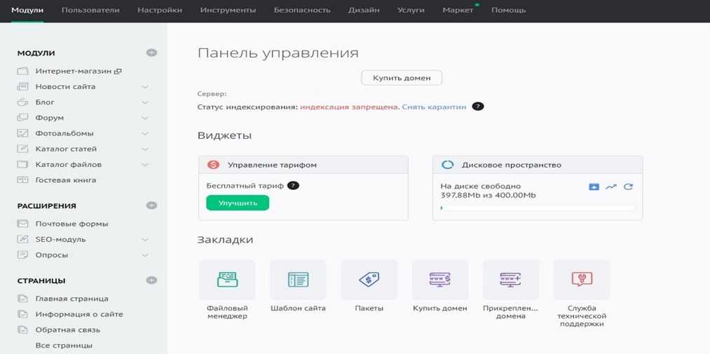 Подходит для начинающих, прост и удобен в использовании. Предоставляет бесплатное доменное имя третьего уровня, а также инструкции по привязке доменов с различными регистраторами (RU-CENTER, Webnames.ru).