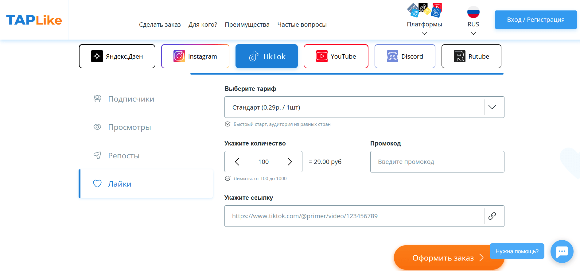 Здесь можно купить нужные реакции для Тик Ток: просмотры, лайки, подписчиков и репосты. Цены достаточно демократичные – 98 рублей за 100 сердечек. Платформа работает со всеми сетями.