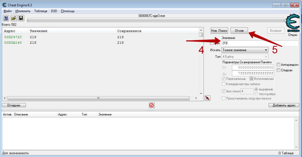 . После сканирования программой данных игры перед Вами появится список результатов, в котором присутствует указанное значение. Чтобы понять, какой из результатов отвечает за количество игровых денег, потратьте небольшую сумму денег в игре, введите новое значение в поисковую строку и выполните поиск, нажав на кнопку «Отсев