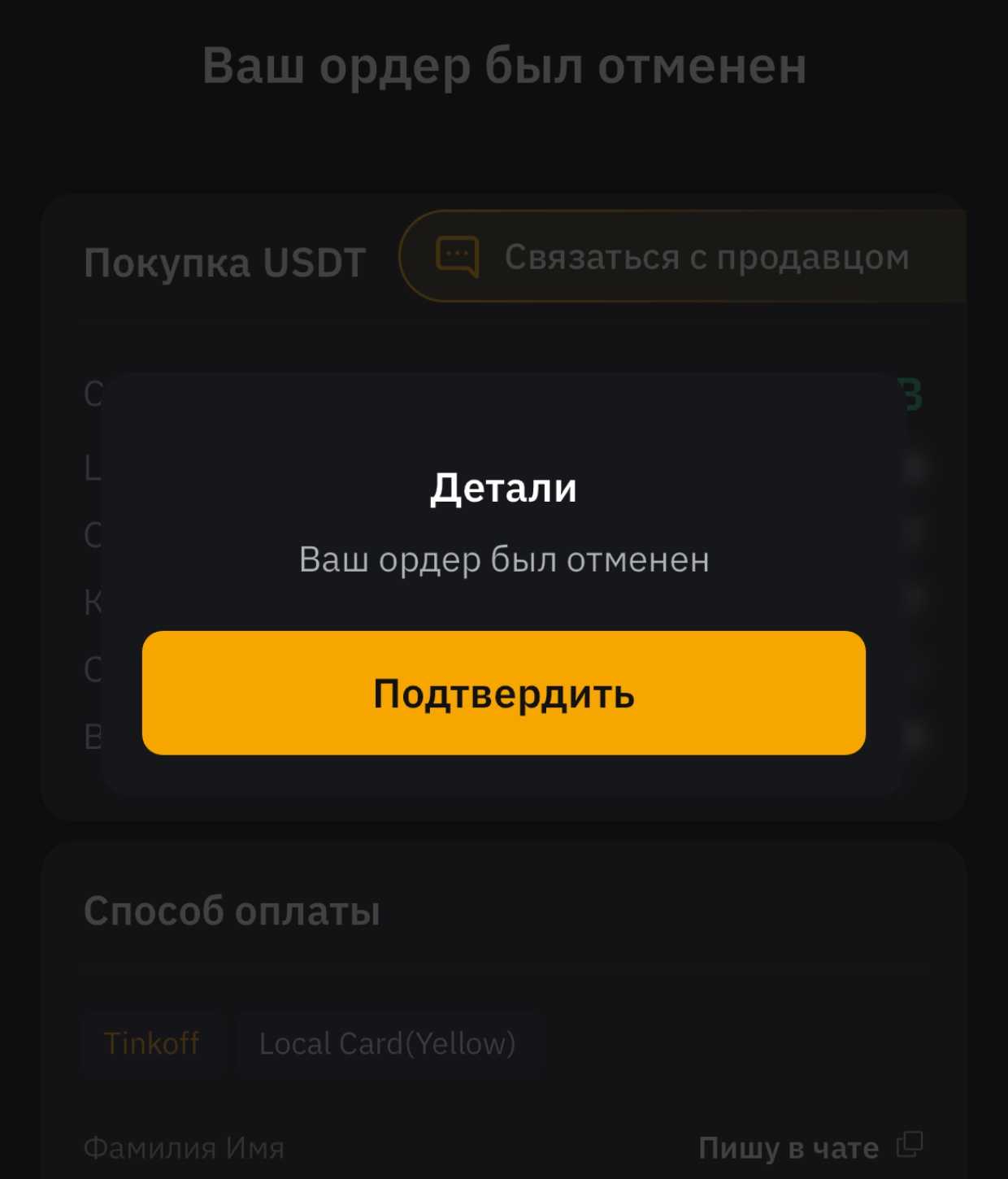 - В момент, когда покупатель, например, создает заявку на продажу криптовалюты за рубли, ему приходит сообщение. В нем продавец может уведомить покупателя о том, что он готов продать токены с одним условием – оплату произведет третье лицо. Простыми словами, деньги на карту покупателя поступят не от продавца, а от другого человека.
