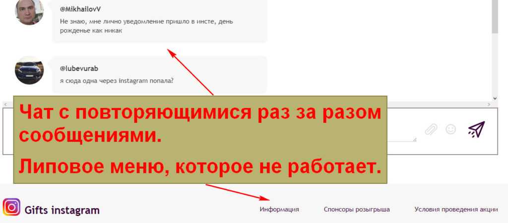 Правда в моём случае попытка с ними побеседовать не увенчалась успехом, все участники в чате полностью игнорировали мои сообщения. В итоге сложилось впечатление, что чат фиктивный, в подтверждение этого говорит тот факт, что через некоторое время переписка повторяется слово в слово. Едва ли это технический сбой, в этом имеется очевидный умысел – повысить доверие в получении приза у зашедшего на сайт посетителя.