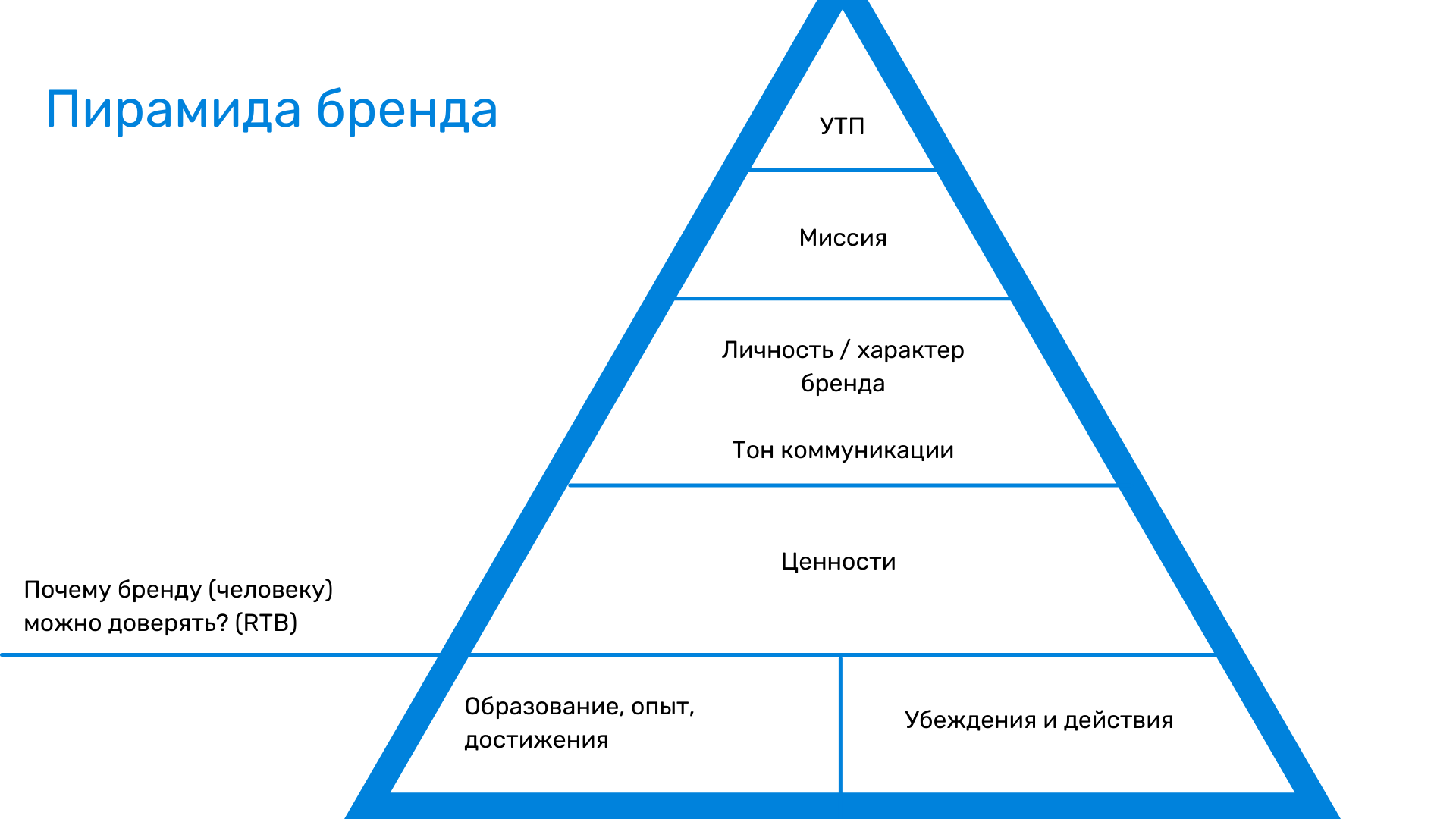 Он включает понимание миссии и ценностей бренда, ниши и целевой аудитории, тона коммуникации и характера бренда. На этом фундаменте строится позиционирование, создается легенда бренда и желаемый пресс-портрет. Я оформляю это в пирамиду бренда