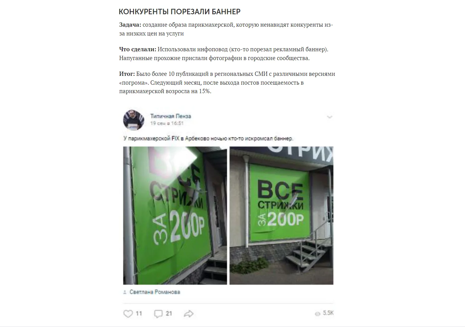 Дмитрий Банчуков и команда специализируются на «вирусном маркетинге». У них куча громких кейсов с ежами-президентами и парнями-пельменями. Но с незапамятных времен я запомнил один конкретный перформанс: ребята продвинули парикмахерскую и увеличили месячную посещаемость на 15%… порезав им баннер.