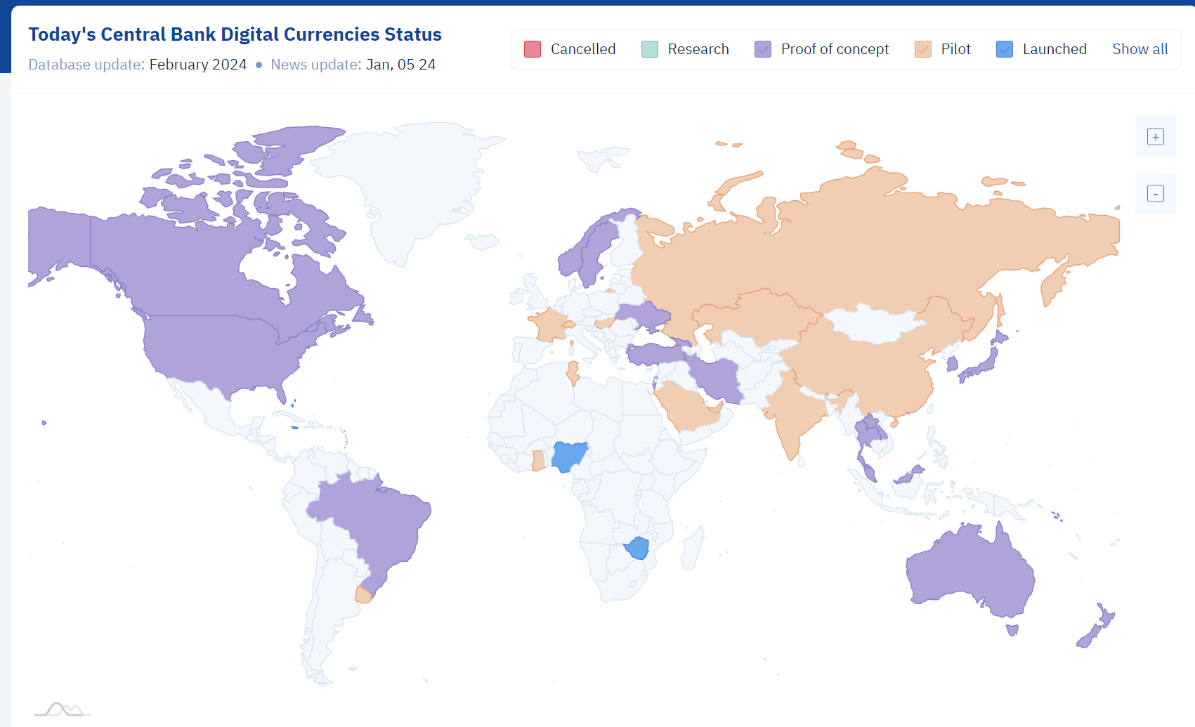 Карта пилотов стран, внедряющих национальные криптовалюты