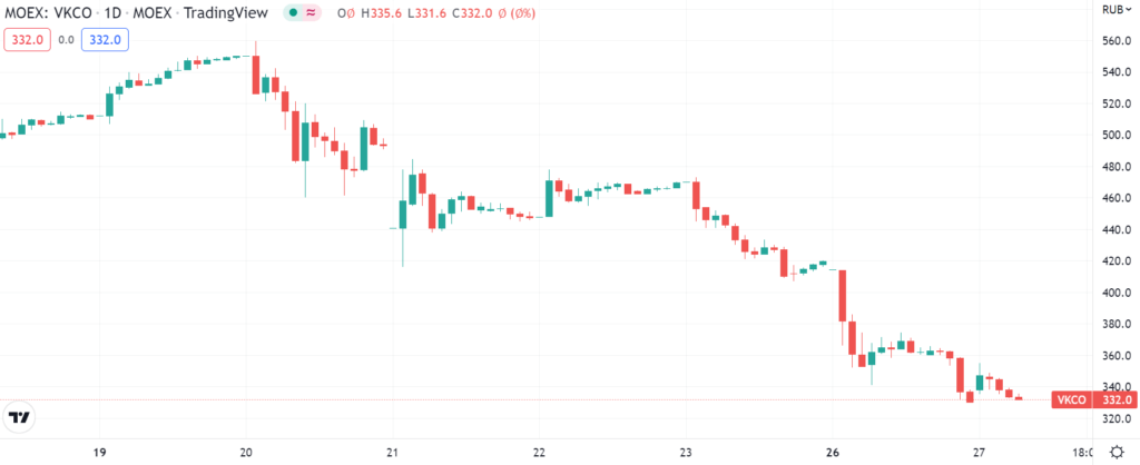 Еще с 20 сентября 2022 года акции VK начали падать. Сейчас стоимость одного актива составляет 332 рубля. Неделей ранее их стоимость доходила до 550,2 рубля за штуку. Что же повлияло на такой сокрушительный обвал?