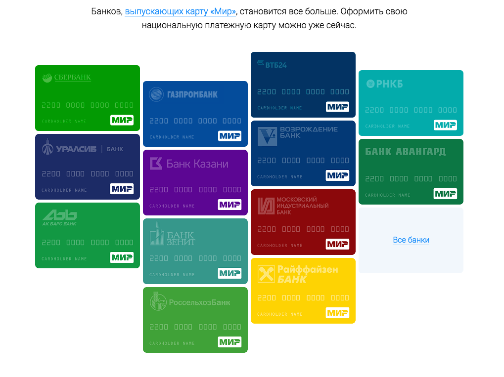В 2019 году получить карту Мир можно практически во всех крупных банках России Сбербанк, ВТБ 24, Альфа-банк, Газпромбанк и тд.