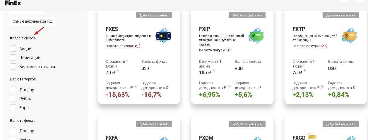 Отобрать нужные фонды поможет фильтр. Можно выбрать фонды по классу активов, по валюте торгов или фонда, а также по цели инвестиций: