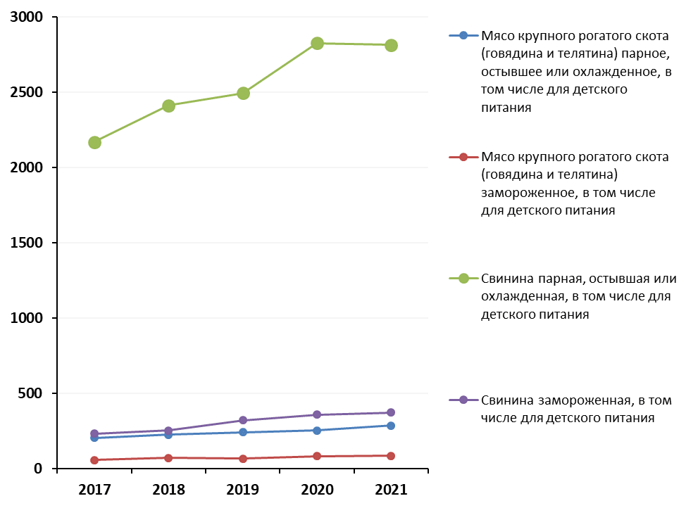 выросло производство ряда позиций: мясо крупного рогатого скота, свинина (парная и замороженная). Если 5 лет назад некоторые категории импортировались на 50% и выше, то сегодня – менее 35%.
