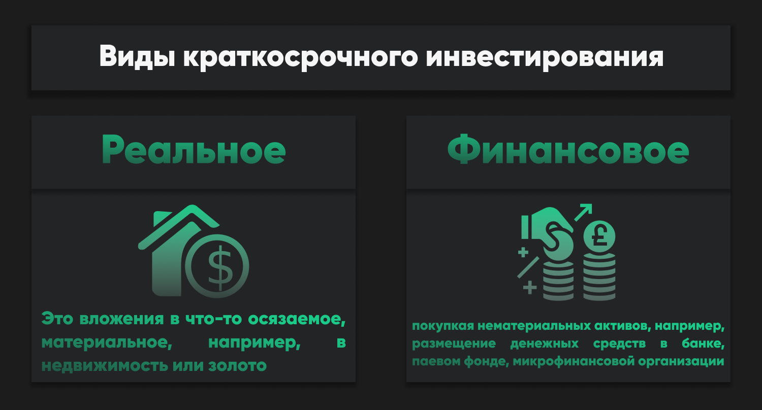 Инвестировать деньги на короткий срок можно в реальные ценности и в финансовые активы.