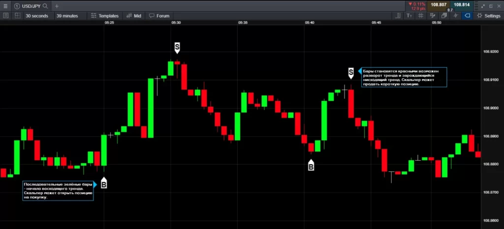 Если в течение нескольких дней подряд столбики зеленого цвета, это может означать начало стремительного роста цены, поэтому скальперы могут открыть позицию на покупку в надежде, что цена продолжит расти. Когда столбики начинают окрашиваться в красный цвет, это свидетельствует о развороте ценового движения и скальперы могут принять решение о короткой продаже валютной пары, чтобы избежать потерь. Скальперы могут повторять эти действия много раз в течение дня, получая прибыль от небольших ценовых движений, которые измеряются в пунктах.