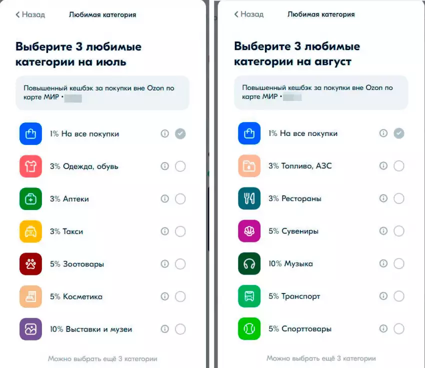 Категории повышенного кэшбэка которые возможны по карте OZON