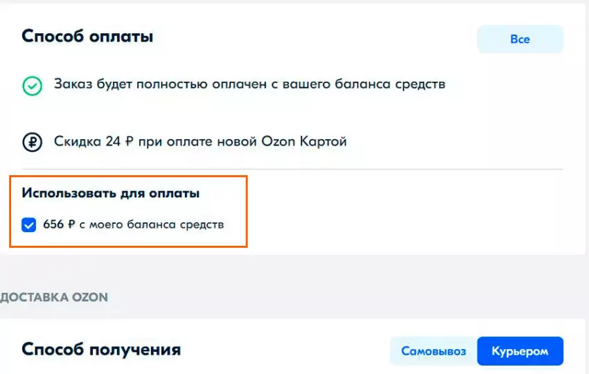 Лайфхак. При оформлении заказа, можно выбрать способ оплаты «OZON карта», скидка будет автоматически рассчитана, но поставить галочку «списать деньги» с баланса средств личного кабинета ОЗОН (это отдельный счет куда «ложатся» деньги после активации промокодов и сертификатов).